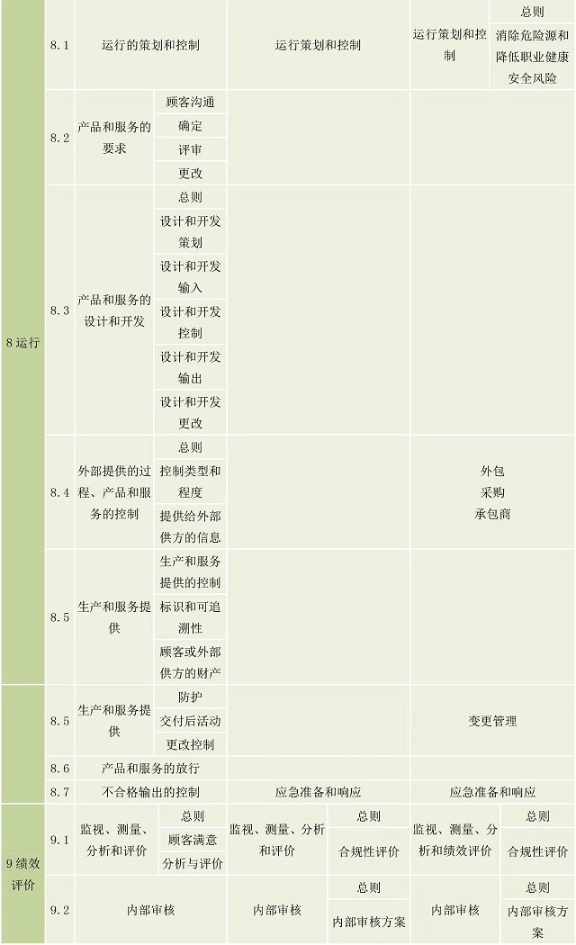 在國內(nèi),組織都是將各個管理體系進(jìn)行整合,質(zhì)量、環(huán)境、職業(yè)健康安全管理體系作為ISO標(biāo)準(zhǔn),均使用了高階結(jié)構(gòu),為體系的整合提供了便利。表2將三個體系的框架進(jìn)行了對應(yīng)于合并,可供讀者參考。
