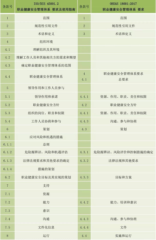 ISO 45001的構(gòu)建是在OHSAS 18001已有的規(guī)范上,其主要目標(biāo)是相同的,都是為提高組織的職業(yè)健康安全績效。同時,通過以下表1框架的對比,也存如下不同之處: